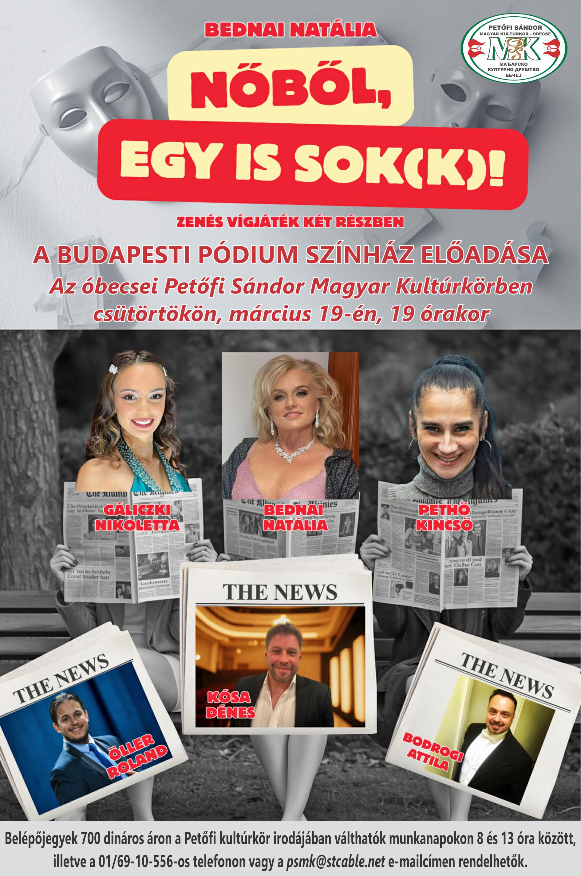 Belépőjegyek 700 dináros áron a Petőfi kultúrkör irodájában válthatók munkanapokon 8 és 13 között, illetve a 021/69-10-556-os telefonszámon és a psmk@stcable.net e-mailcímen rendelhetők. |