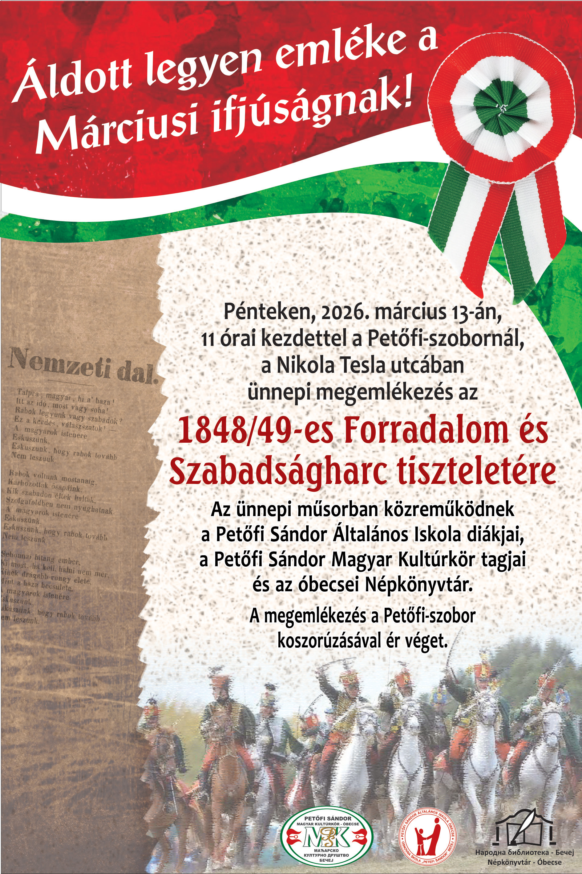 Pénteken, március 13-án, 11 órakor "ÁLDOTT LEGYEN EMLÉKE A MÁRCIUSI IFJÚSÁGNAK"-Ünnepi megemlékezés Óbecsén a Petőfi szobornál Ünnepi megemlékezés az 1848/49-es Forradalom és Szabadságharc tiszteletére a Petőfi szobornál, a Nikola Tesla utcában.